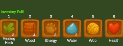 Inventory system - player collects items and uses them to increase stats: health, stamina, hunger, hydration. If all slots are occupied - inventory is full and player can't add new stuff.