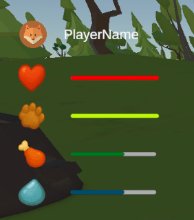 Resource collection & crafting — gather food, water, and items to stay alive and improve your stats.