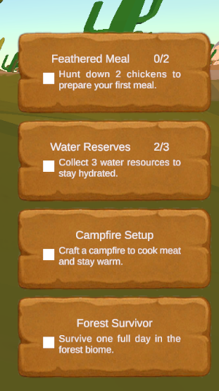 Quest System — complete hunting and collecting missions, earn rewards, and progress your journey. Crafting and survival to be implemented.
